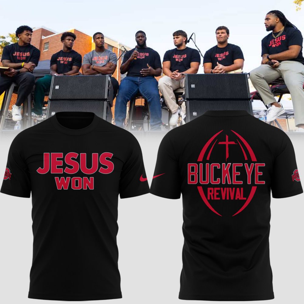 Introducing the Special New Ohio State Football JESUS WON Tshirt 2025, a unique blend of faith and team spirit. Perfect for fans who celebrate victory in both sports and life, this shirt showcases your passion and beliefs. Wear it proudly and let your support for the Buckeyes and your faith shine with the Special New Ohio State Football JESUS WON Tshirt 2025.